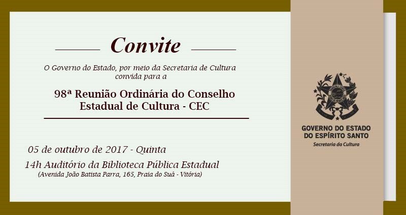 A Secretaria de Estado da Cultura convida para a 98ª Reunião Ordinária do Conselho Estadual de Cultura- CEC, nesta quinta-feira (05/10), às 14h. Local: Auditório da Biblioteca Pública Estadual, Avenida João Batista Parra, 165, Praia do Suá, Vitória.