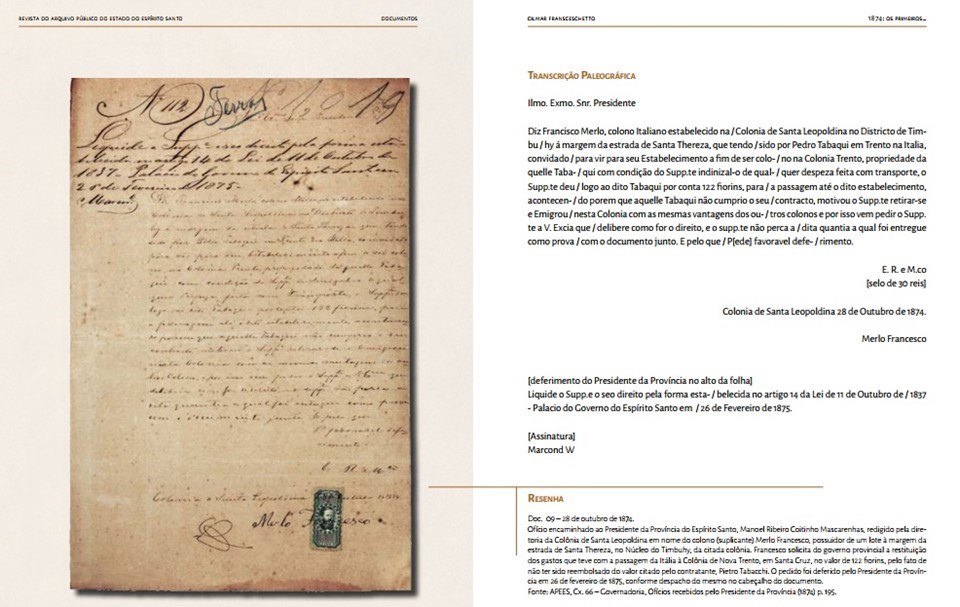 Na seção “Documentos” haverá a apresentação de um ofício remetido pela direção da Colônia de Santa Leopoldina ao Presidente da Província do Espírito Santo, datado de 26 de outubro de 1874, referente à presença dos primeiros italianos em Santa Teresa, no interior capixaba, naquele ano. Além disso, a publicação contará com uma resenha crítica à segunda edição do livro “Negros do Espírito Santo”, do professor Cleber Maciel e, por último, o Relatório de Gestão do ano de 2016 do Arquivo Público.